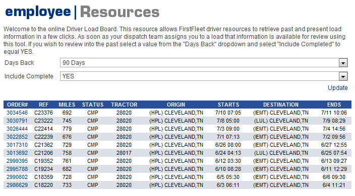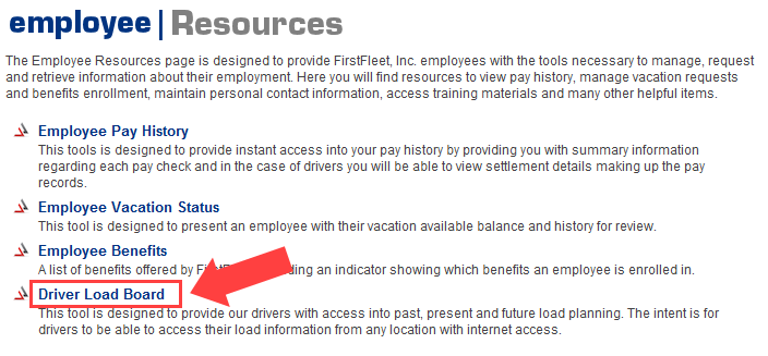 One of the most often requested features we have is for a driver to be able to obtain his/her load assignment information without having to be near the truck or by calling dispatch. We have heard this concern and are happy to announce a new tool to make this interaction much easier for all FirstFleet, Inc. drivers. Starting today we have a new tool called the Driver Load Board (myPortal -> Employee Resources) which we hope will address this problem in an efficient manner.