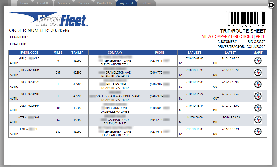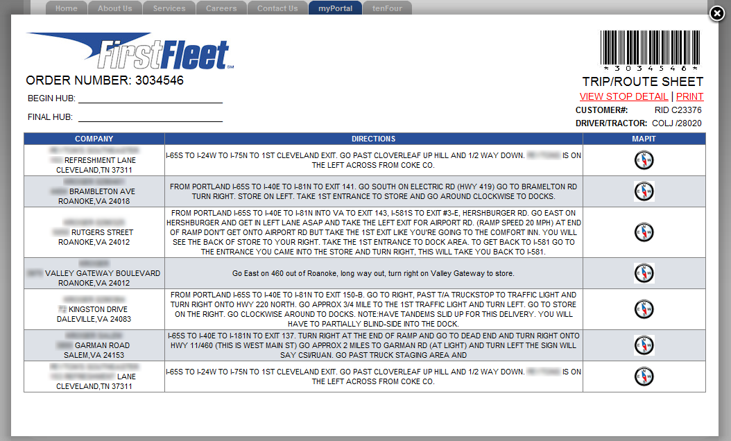 - In the stop detail window you have the option to view the on file Company Directions (click to view)