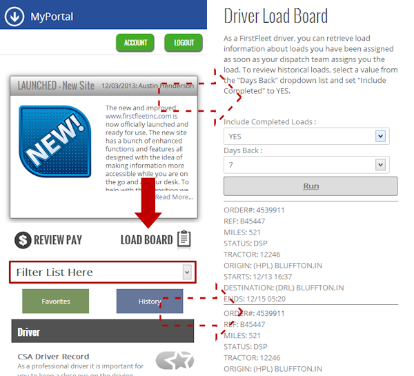 Viewing loads using the driver load board has also been slightly enhanced for speed. Notice in the screenshot below that now right from the myPortal page you can tap LOAD BOARD to be taken directly to the driver load board. From the drover load board you will see a listing of loads - you will need to select from the options how far back and if you want to include loads that are completed (in the past). Once you make your selections and tap RUN you will see an image like below.