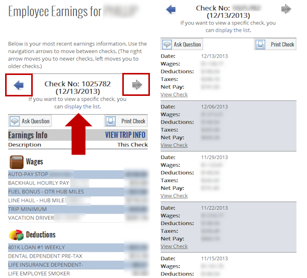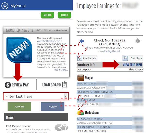 The image on the left is the initial load of the myPortal page. Once you tap the REVIEW PAY icon it will take you to a page which looks like the image on the right. In the image on the right you will see a RED arrow pointing to VIEW TRIP INFO. If you tap here you will be taken to a review of your trips for the check number you are evaluating.