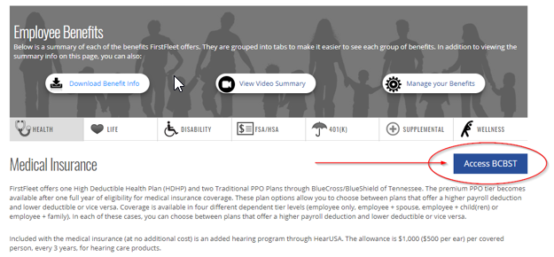 We do have some new features for the plan this year to make the PHA and BMS much easier for all participants. For the PHA, you can now reach the Blue Cross website directly from your FirstFleet portal account. On your Employee Benefit Info page, you can on the link “Access BCBST” to log directly into your BlueAccess account.