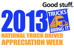 Truck Driver Appreciation Week 2013 Wednesday, September 18, 2013 Daniel Piper This week marks the American Trucking Association’s truck driver appreciation week. The week of September 15-21 is set aside to celebrate and honor the efforts of America’s 3.1 million professional truck drivers. Our... Read More of the article Truck Driver Appreciation Week 2013